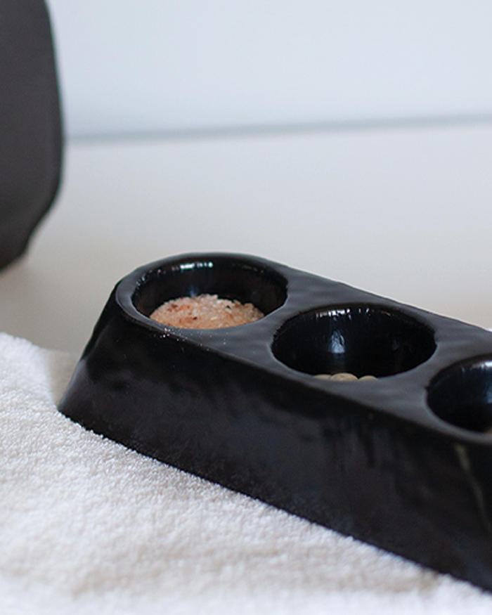 Blending the grounding tones of granite and clay with the fluid clarity of translucent blue – timeless and modern, bringing harmony to any spa space.