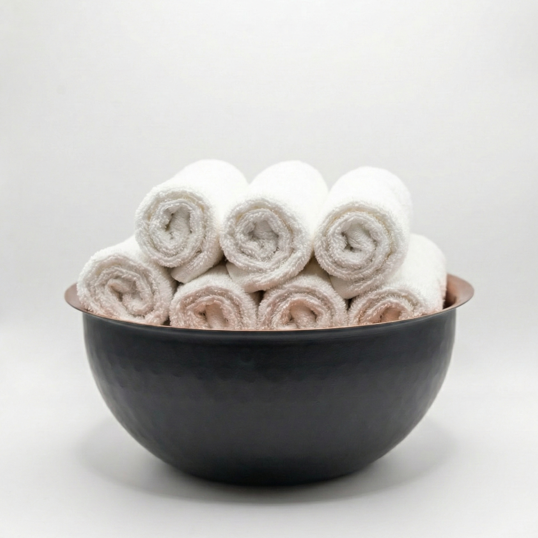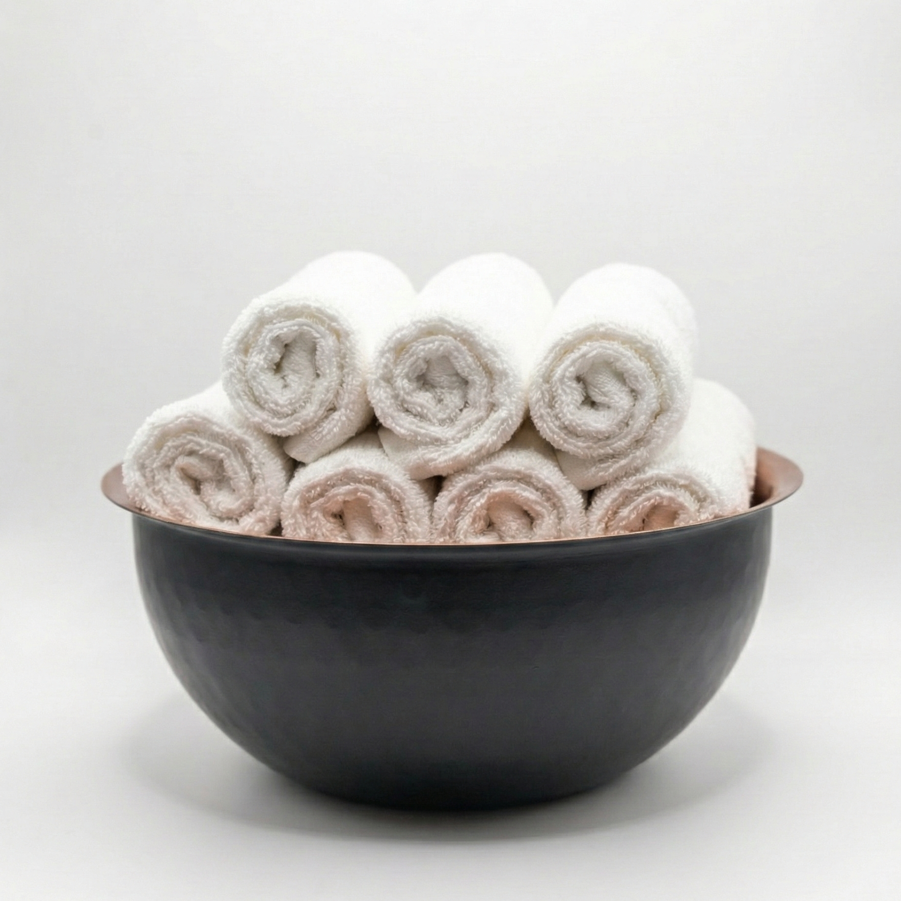 Designed for hand/manicure soaks, warm towel service, or product presentation, this elegant Mini Bowl brings sophistication and function to every step of the client experience. The hammered copper interior offers the natural antibacterial benefits of copper, while the matte black exterior adds a timeless, modern touch to any treatment space.
