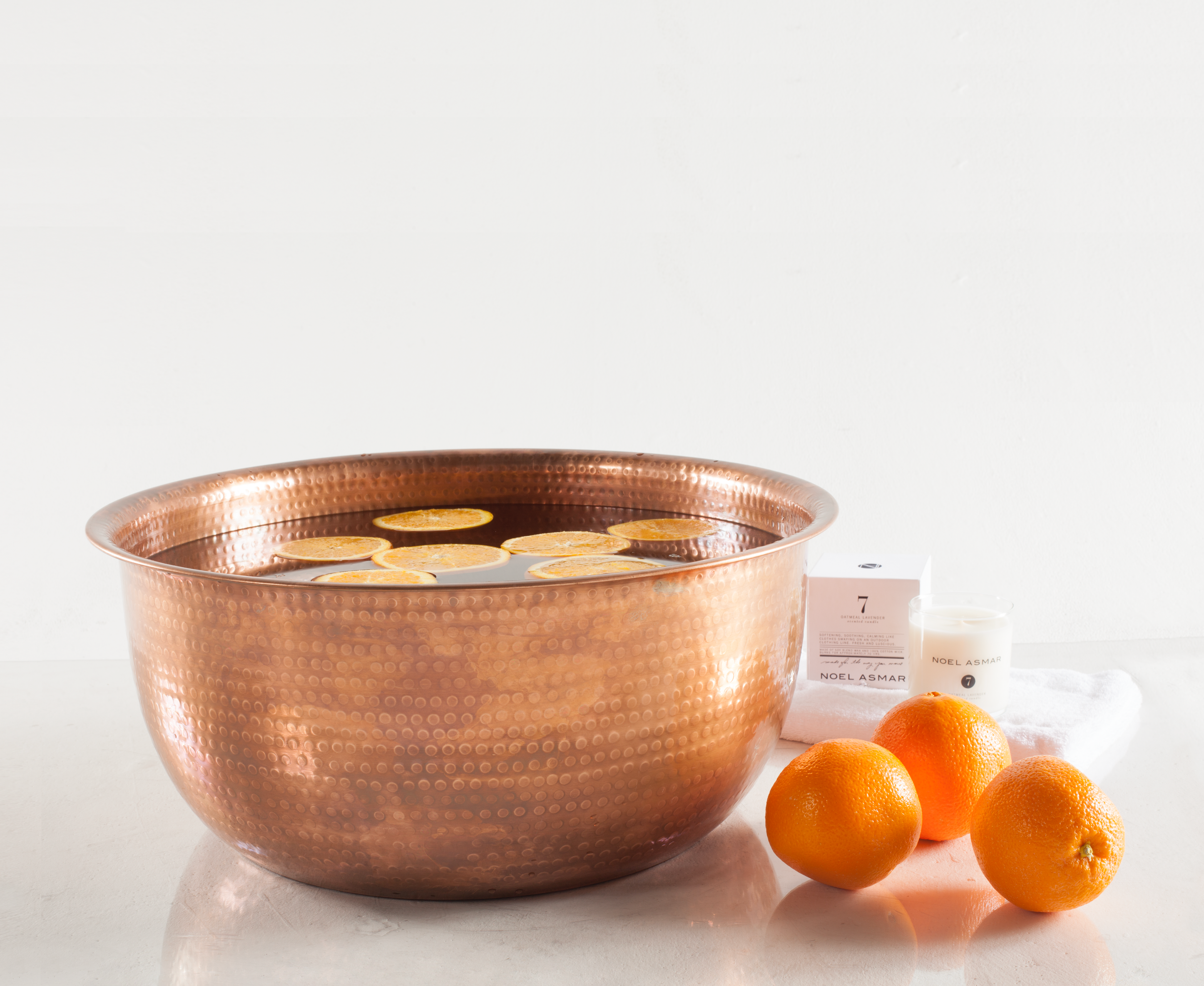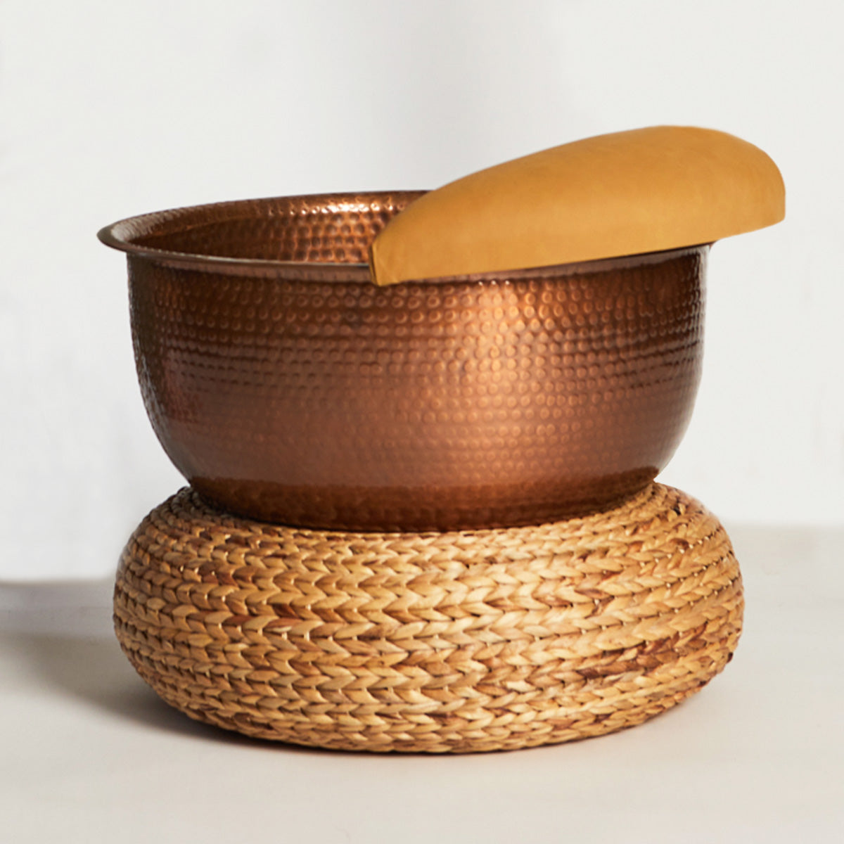 The Luxe Stainless Pedicure Set includes the Hand-hammered Copper Pedicure Bowl, Padded Footrest, and Banana Leaf Stool.
