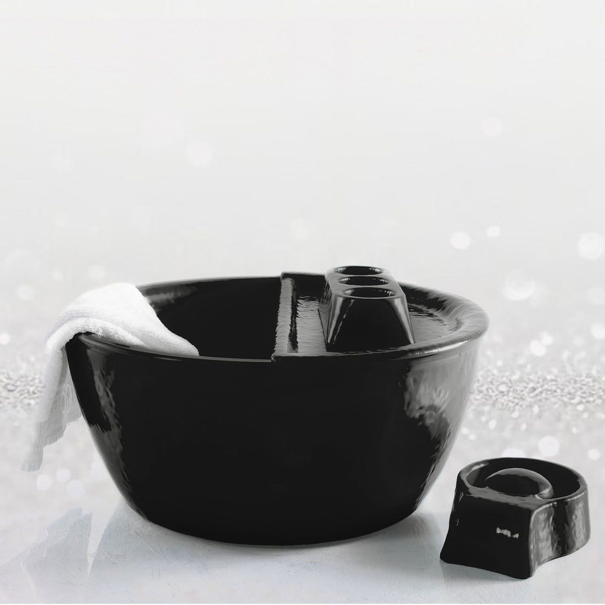 The Onyx Pedicure Set includes the Signature Onyx Pedicure Bowl, Onyx Footrest, Treatment Dish, and Manicure Dish. Made with lightweight resin. Alluring “Onyx” creates a modern and sophisticated treatment area in any setting.